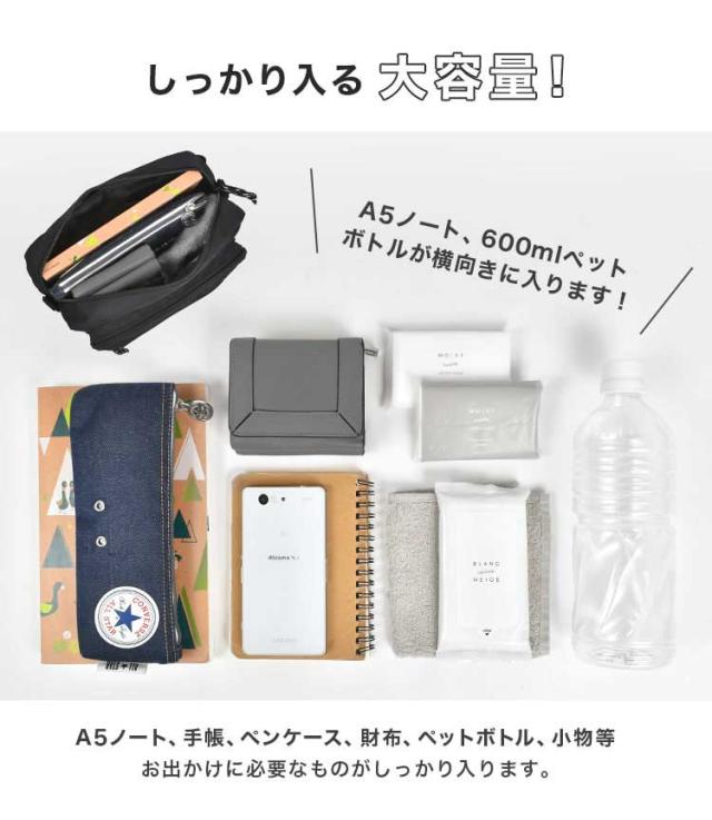 さりげないロゴがスタイリッシュで、コーデに合わせやすく持ちやすいデザインです。2WAY仕様になっているので、ショルダー紐を取り外せばボディバッグにスタイルチェンジできます。お出かけに必要な持ち物はもちろん、ペットボトルや人気のゲーム機も横向きにすっぽり入ります。外側と内側にポケットが沢山付いているので、小物整理もしやすく便利なバッグです。