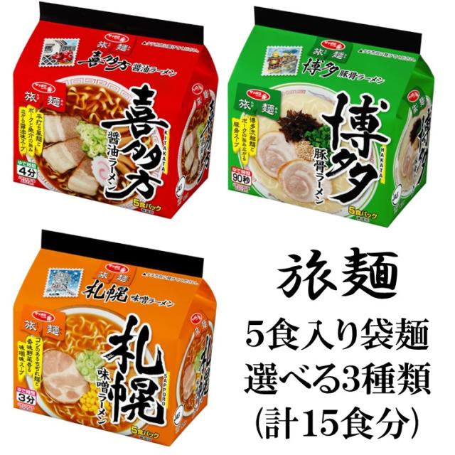 サッポロ一番 5食入り袋麺 旅麺 喜多方醤油ラーメン、札幌味噌ラーメン、博多豚骨ラーメンからお好みで3袋をお選び戴けます。