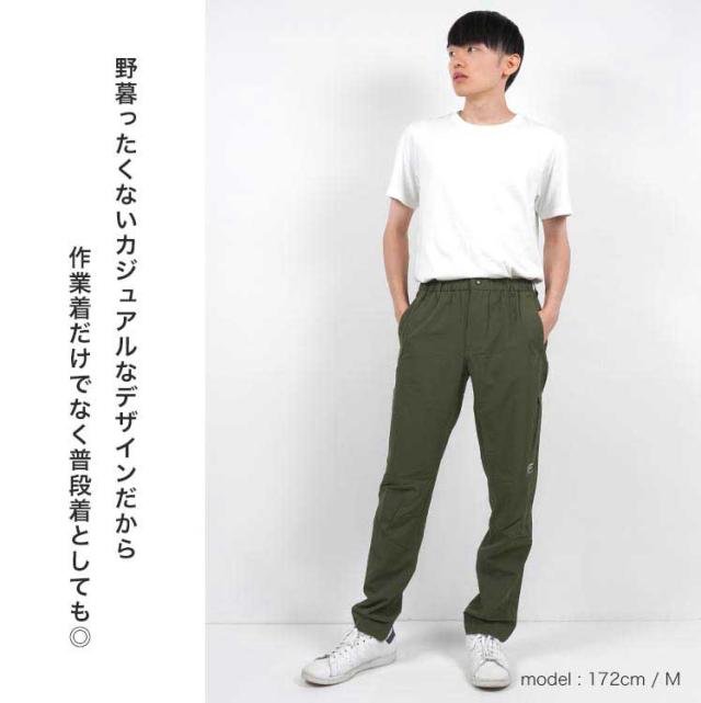 スマートなシルエットで作業から普段着まで活躍する、ストレッチ素材を使用したトレッキングパンツ。伸縮性が高く激しい動きや様々な体勢にも対応できるので、動きを邪魔せず快適に過ごせます。撥水効果のある生地を使用しているので水や汚れを弾きやすく、登山やスポーツ、アウトドアシーンにもおすすめ。野暮ったくないカジュアルなデザインなので普段着としても使えます。