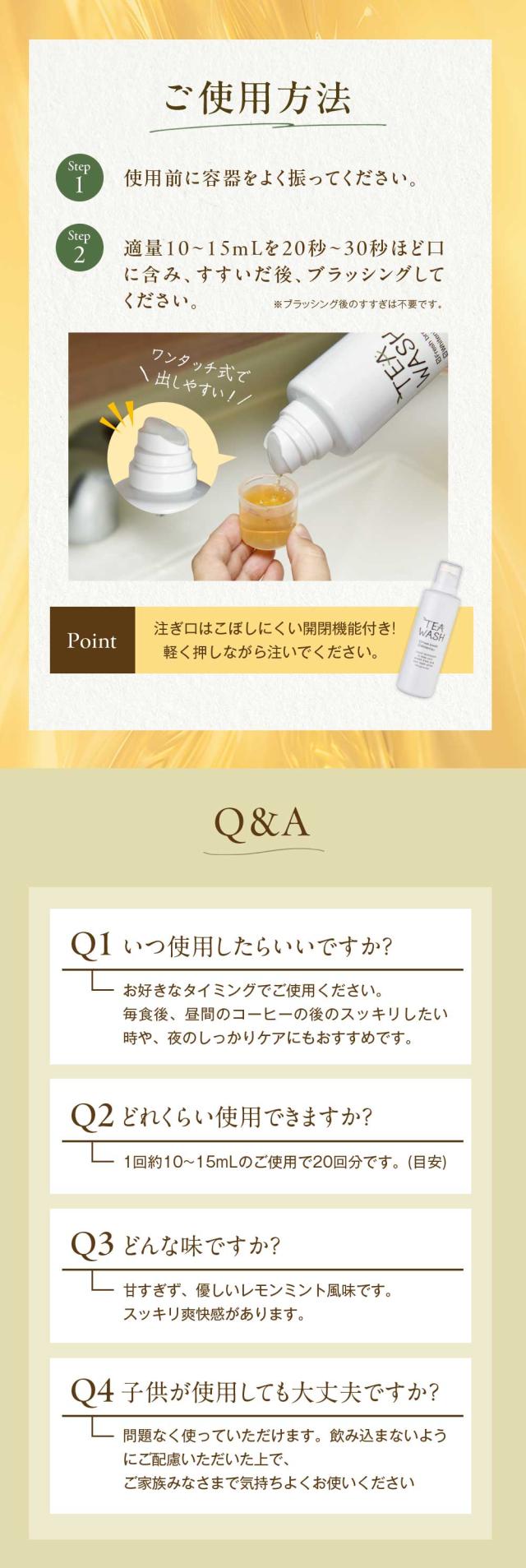 | 【使用方法】 | 使用前に容器をよく振ってください。適量10〜15mLを20〜30秒ほど口に含み、すすいだ後、ブラッシングしてください。■1回約10〜15mLのご使用で20回分(目安) |