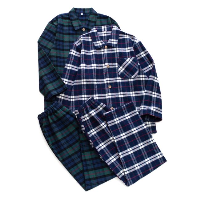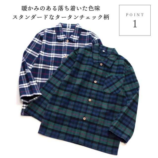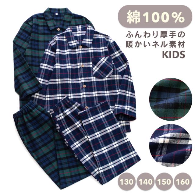 パジャマ キッズ 男の子 女の子 綿100% 長袖 冬 前開き ボタン 厚手のネル起毛 先染め タータンチェック柄 グリーン ネイビー 130 140 150 160 子供 ジュニア ボーイズ ガールズ おそろい