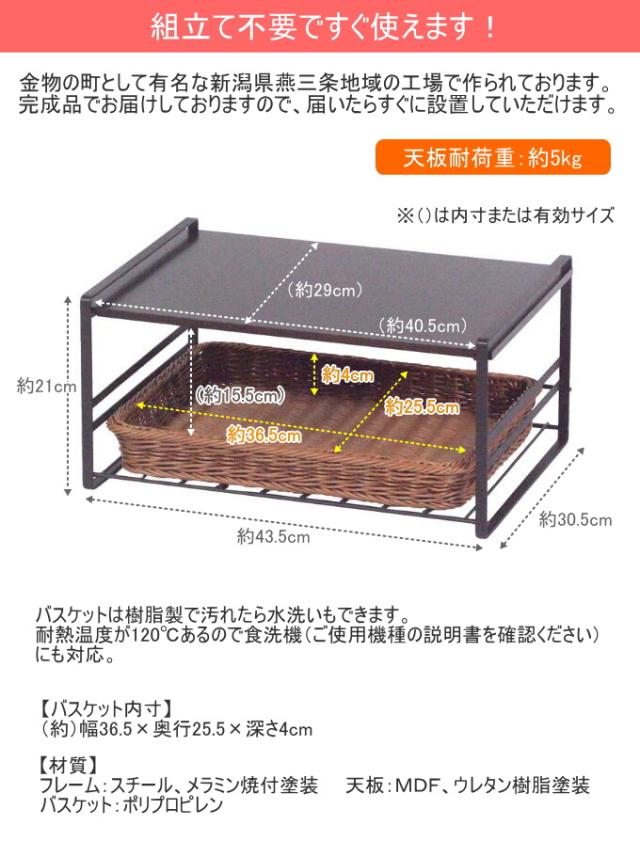 本体サイズ:(約)幅43.5×奥行30.5×高さ21cm 天板有効サイズ:(約)幅40.5×奥行29cm バスケット内寸:(約)幅36.5×奥行25.5×深さ4cm バスケット上内寸高さ:(約)15.5cm |
