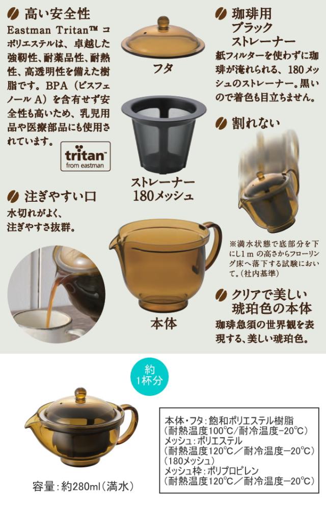 紙フィルターいらずで手軽に深いあじわい。 トライタン製でわれない珈琲急須です。 【珈琲急須とは?】 ハンドドリップよりも手軽にコーヒーを淹れることができる、新ジャンルのコーヒー抽出器具です。 一般的なペーパードリップに比べてコーヒーオイルをダイレクトに抽出することができ、豆の個性を余すことなく、深いあじわいを楽しむことができます。 【トライタンについて】 卓越した強靭性、耐薬品性、耐熱性、高透明性を備えた樹脂。BPA(ビスフェノールA)を含有せず安全性も高いため、乳児用品や医療部品にも使用されています。 珈琲急須の世界観に調和する美しい琥珀色。 微粉が出にくい細かいメッシュです。珈琲の着色が目立たない黒色を採用。 食器洗い乾燥機対応。 |