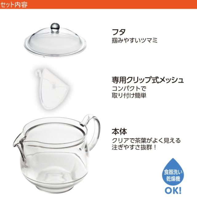 プラスチック製で割れにくいティーポットに、クリップメッシュタイプが登場! 注ぎ口に小さなメッシュを取り付ける構造なので、茶葉がお湯にたっぷり浸ります。 茶葉の様子がよく見えるから、花茶にもおすすめです。 たっぷりはいる大きめサイズ。 食器洗い乾燥機対応。 |