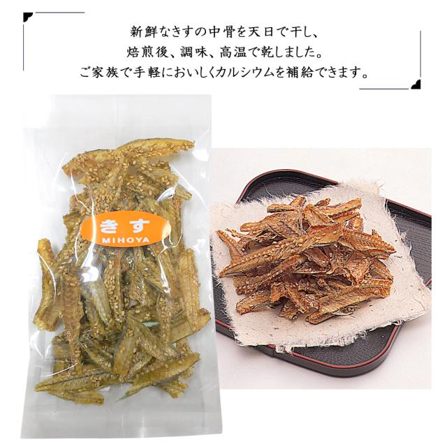 新鮮なきすの中骨を天日で干し、焙煎後、調味、高温で乾しました。
