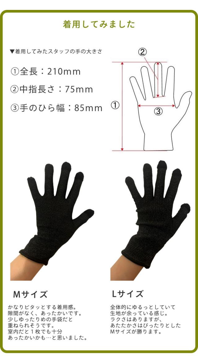 Mサイズ:全長210mm、中指長さ70mm、てのひら幅85mm