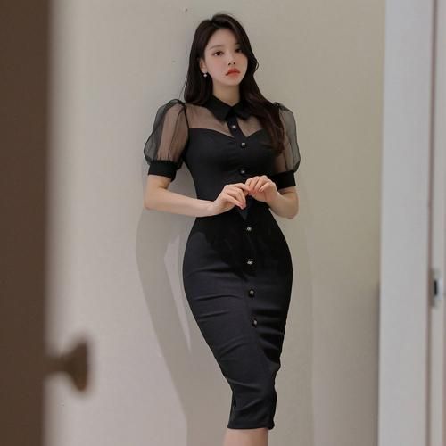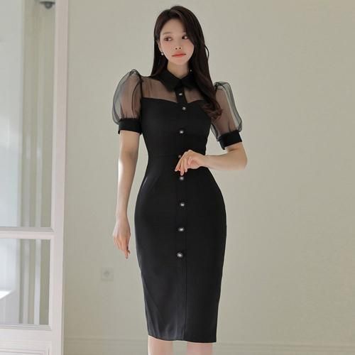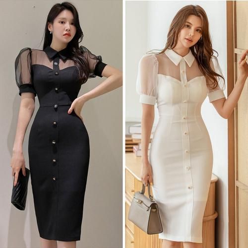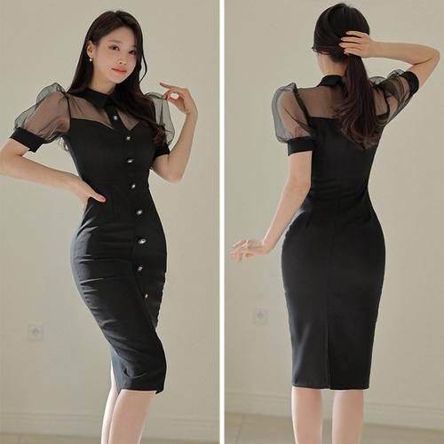 襟付きミディ丈シアーワンピース(キャバドレス・CABARETDRESS)。