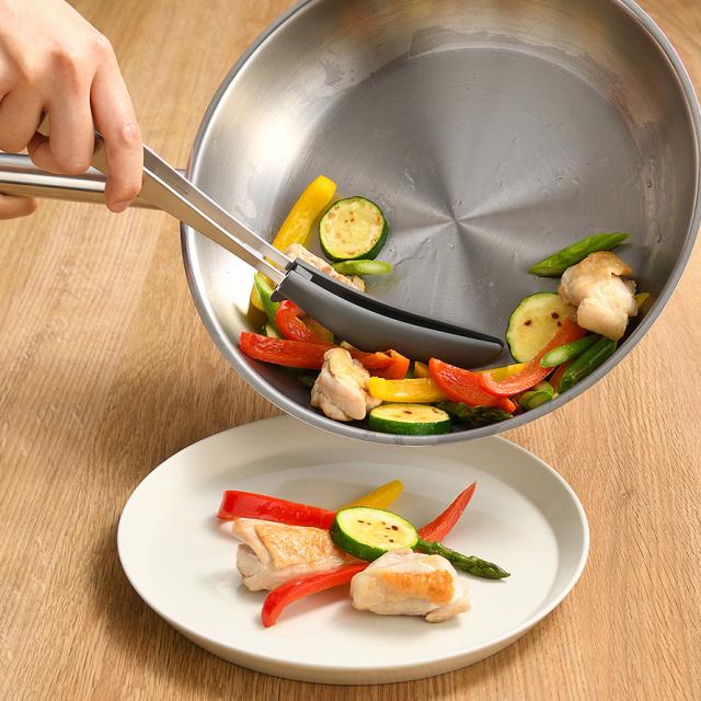 平らな面で、手早く炒めやすい『炒めトング』炒め物に最適な、長めのトングです。