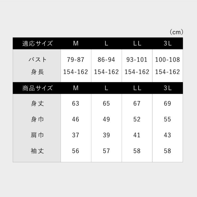 ■サイズ:身長154-162、M/バスト79-87、身丈63、身幅46、肩幅37、袖丈56、L/バスト86-94、身丈65、身幅49、肩幅39、袖丈57、LL/バスト93-101、身丈67、身幅52、肩幅41、袖丈58、3L/バスト100-108、身丈69、身幅55、肩幅43、袖丈58cm