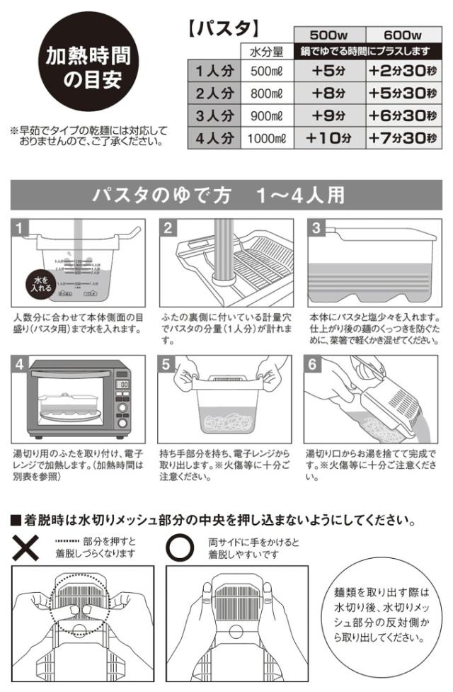 お鍋を使わずに電子レンジで手軽にパスタが作れます。 湯切りできる水切りメッシュ(着脱可能) 安心の持ち手形状。 必要な水量がひとめでわかる便利なメモリ付。 そうめんもゆでられます。 ※早ゆでタイプの乾麺には対応しておりませんのでご了承ください。 ■その他の電子レンジ用調理グッズはこちら↓ 電子レンジ用調理グッズ |