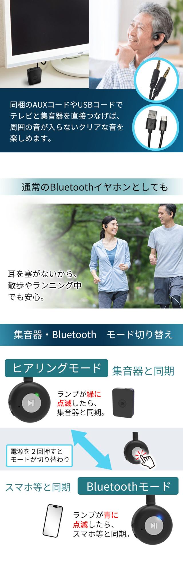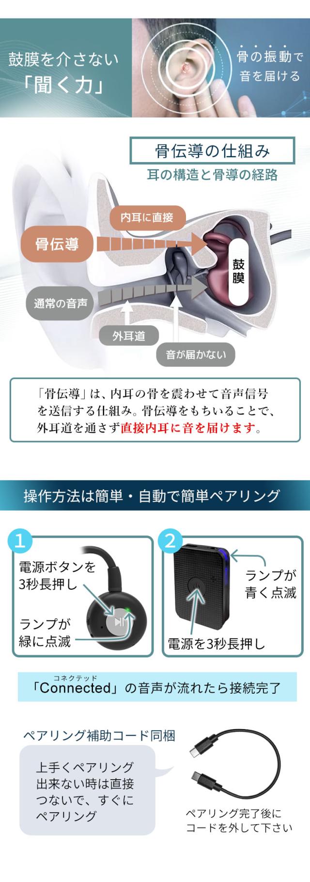 ※一般的な骨伝導イヤホンの特性上、内耳の影響によりお耳が聞こえにくい方に対しては伝達がされ難い場合がございます。