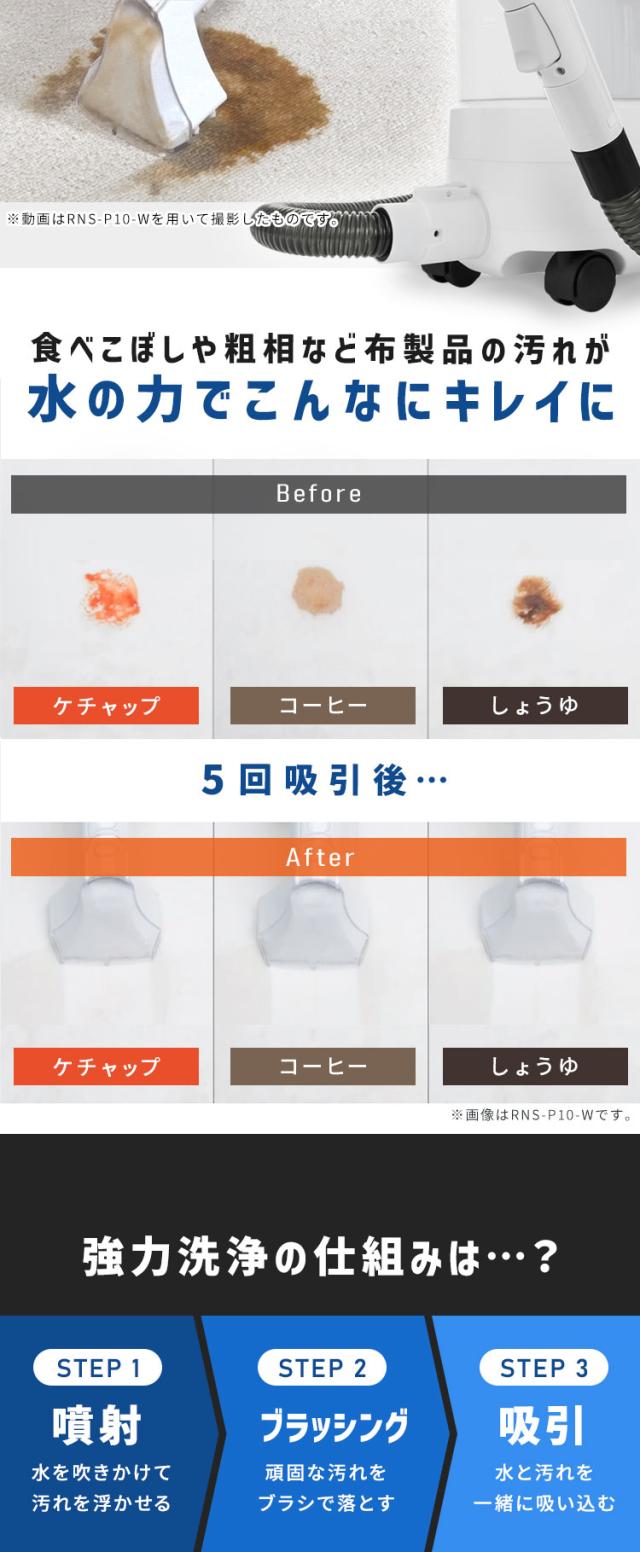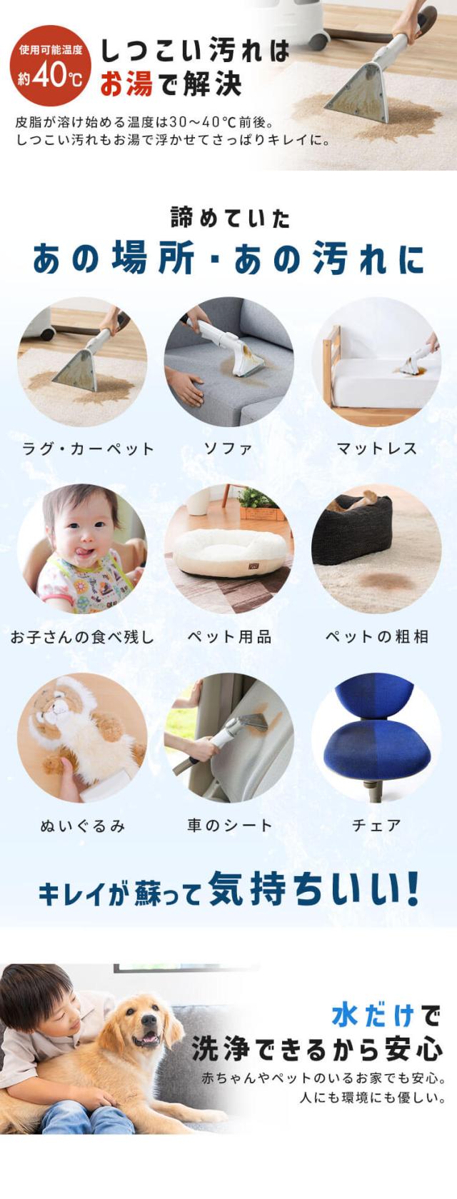 ◆リンサークリーナーだから食べこぼしや粗相など布製品の汚れが水の力できれいに落ちる。