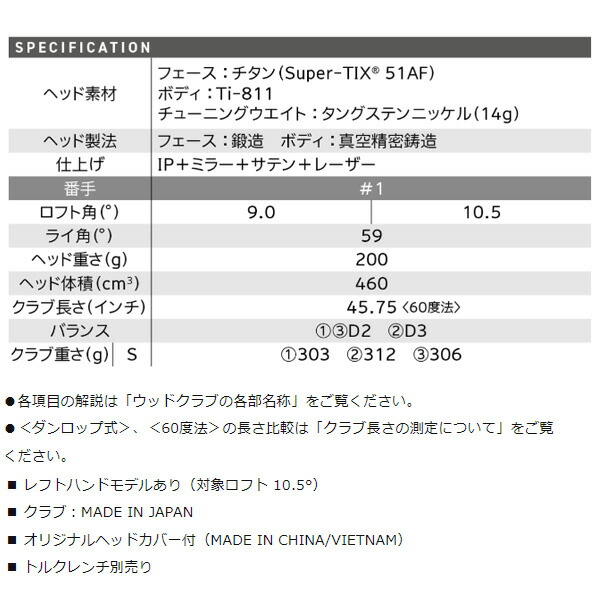 ・ヘッド素材:フェース/チタン(Ti72S)、ボディ/Ti-811Plus、チューニングウェイト/ステンレス(10g)アルミニウム(4g)