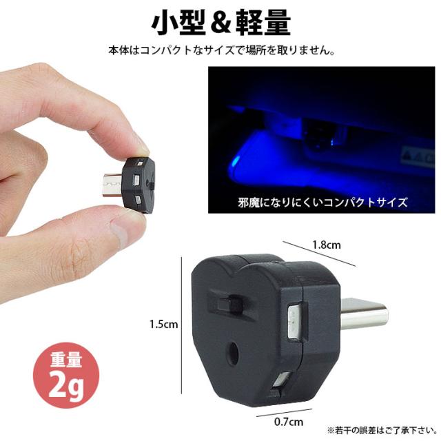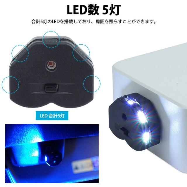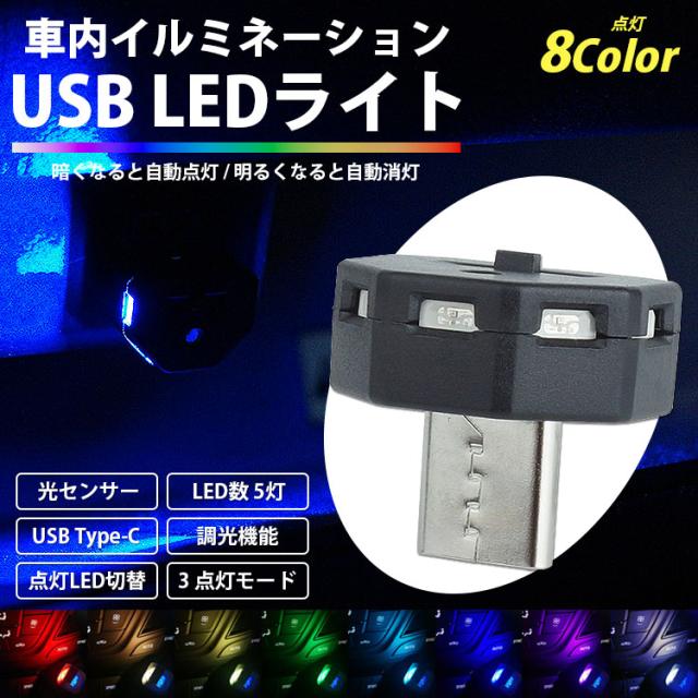 USB LED ライト イルミネーション USB Type-C 調光機能 光センサー LED数 5灯 発光 8カラー メモリー機能付き USB給電 簡単取付 明るさ調整 自動点灯 消灯 小型 コンパクト 車内 車 車用品 点灯LED切替 PR-UL009【メール便 送料無料】