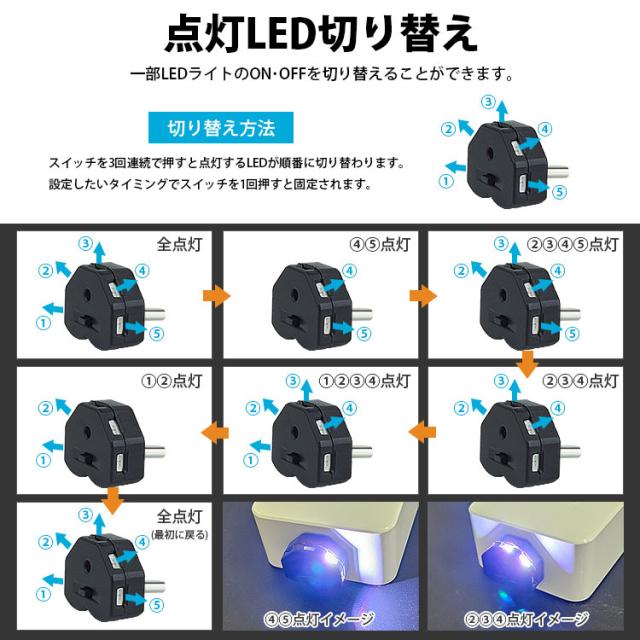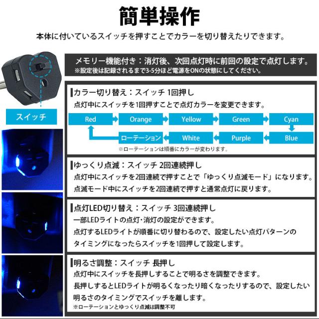 点灯モードは単色点灯・ローテーション・ゆっくり点滅の3種類からお選び頂けます。