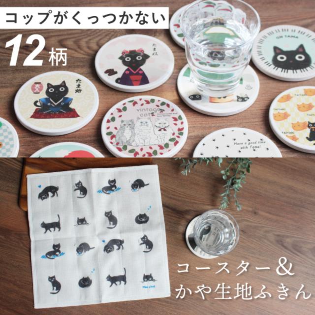 コースター 吸水コースター 白雲石 かや生地ふきん セット 丸 猫 グッズ ねこ 吸水 速乾 丈夫 ノアファミリー かわいい 黒猫 グッズ ギフト ネコ 猫好き コルク 誕生日 プレゼント 和 海外 外国 コップ受け グラス置き キッチン雑貨 おうちカフェ 母の日