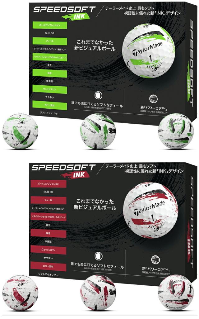 『TP5 pix』や『TP5x pix』でも使用される印刷方式を採用したことで高いコントラストと視認性を実現した『SPEEDSOFTTM INK』は、カラフルなインクのしぶきが特徴的な最新ビジュアルを採用。さらに、高いボール初速性能を維持しながらも心地良い打感と打音に注力し開発された「SPEEDSOFTコア」が、適正なスピンを生み出し飛距離アップに貢献します。また気分や好みに合わせて選べるグリーン、レット?、ブルー、ピンクの4色を展開し、ボール選びをもっと楽しく自由にすると同時にコ?ルフに新たな彩りを与えます。