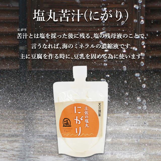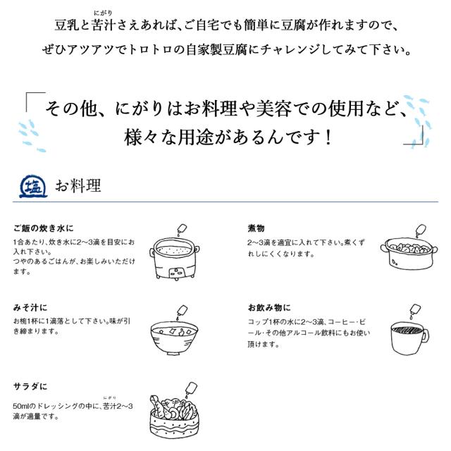 にがりとは塩を採った後に残る塩の残母液のことで、言うなれば海のミネラルの濃縮液です。