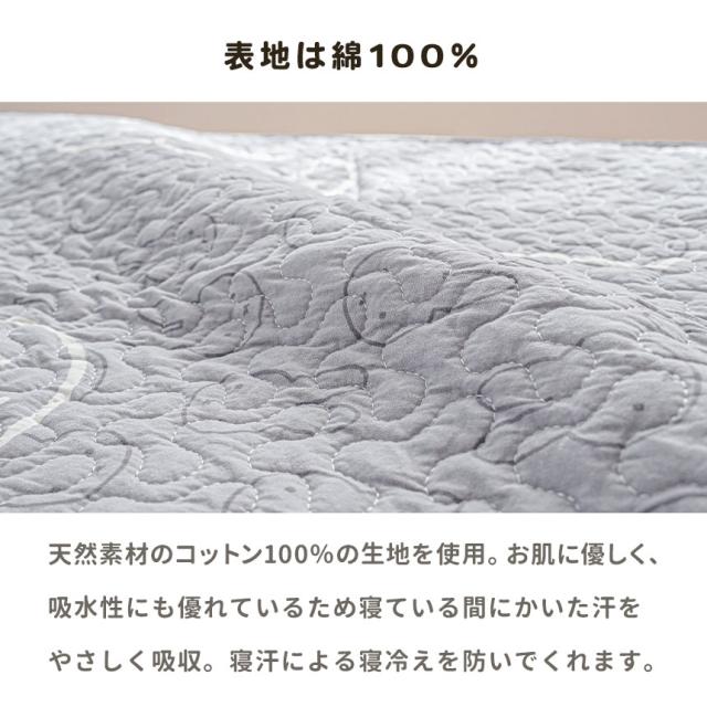 | ・大人気キャラクター!ミッフィーのかわいいデザイン ミッフィーのお顔が散りばめられた可愛いデザイン。グレーとホワイトの2色展開で大人も子供も、性別問わずお使いいただけます。 ・表地は綿100%天然素材のコットン100%の生地を使用。お肌に優しく、吸水性にも優れているため寝ている間にかいた汗をやさしく吸収。寝汗による寝冷えを防いでくれます。 ・水洗いのひとてま先に一度水を通した生地で作りました。ひと手間をかけた生地はその分、肌当たりがとっても優しい風合いに仕上がっています。 ・洗濯機で洗える汗をかいても、汚しても、気軽にお洗濯できるのが嬉しい。洗濯ネットに入れて、洗濯機でじゃぶじゃぶ丸洗い。 ・安心の西川品質品質にこだわりたい方も安心。日本有数の寝具メーカー「西川」の製品です。長い歴史の中で、積み重ねられたその技術は、高い品質と信頼があります。 | |