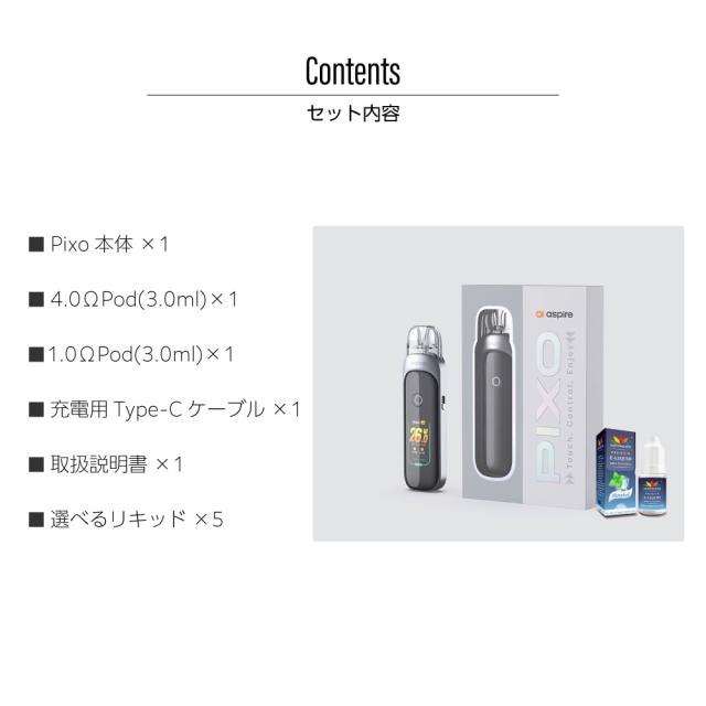 ![]() | ⇒ Aspire Pixo (アスパイア ピクソー)選べるリキッド10本セットはコチラ 選べるリキッドが10本付いたとってもおトクなセット。 |