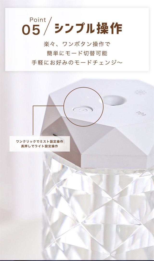 4.ミスト設定操作:ボタンのワンクリックで連続ミストモード開始・2回クリックで2秒〜3秒間隔の間隔ミストモードに切替・3回クリックでミストのオフモード