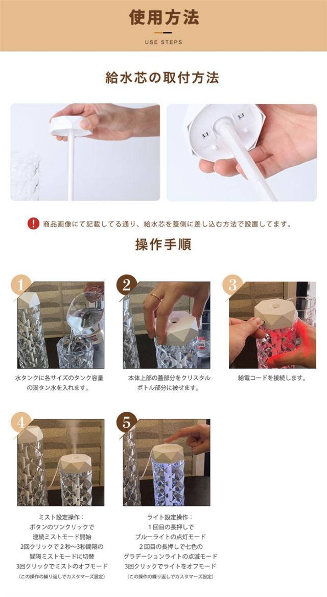 1.水タンクに各サイズのタンク容量の商品サイズ毎、満タン1000ml or 400ml水を入れます。 2.本体上部の蓋部分をクリスタルボトル部分に被せます。