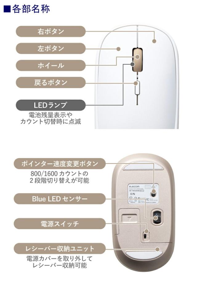 インナーケースやポーチに入れて持ち運びしやすい厚み28mmの薄型マウスです。 デスクになじむベーシックカラーのボディ。ボトムケースとホイールに取り入れたさりげないアクセントカラーがポイントです。 クリック時のカチカチ音がしない静音スイッチを採用。静かなオフィス内など音が気になる場所でも使えます。 小さな凹凸やホコリでもより正確に光が反射し、場所を選ばずに快適に使用できるBlueLEDを搭載しています。 ポインターの移動速度は800/1600カウントの2段階で切り替え可能です。 Webページの閲覧などの操作に便利な「戻る」ボタンが付いた4ボタンタイプです。 ノートパソコンのUSBポートに接続しても気にならず、装着したまま持ち運び可能な1円玉サイズのマイクロレシーバーを採用しています。 レシーバーはマウス本体内に収納可能なので、持ち運びに便利。レシーバーを紛失する心配を軽減します。 本体裏面に電源スイッチがあり、不使用時の電池の消耗を防止できます。 電池の交換時期をお知らせする電池残量表示ランプを搭載しています。 左右対称で、右利き・左利きを問わず使いやすいシンメトリーデザインを採用しています。 |