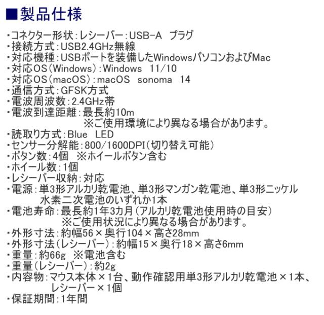 マウス本体×1台、動作確認用単3形アルカリ乾電池×1本、レシーバー×1個 |