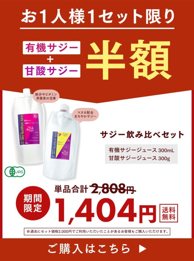 | 原材料名 | 有機サジージュース(中国青海省産)、蜂蜜(百花蜜)、蜂蜜(マヌカハニー) |