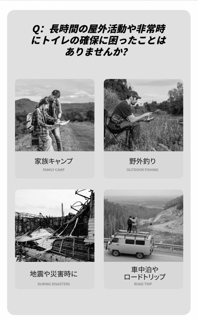 車中泊やロードトリップ: 長距離ドライブ中でも、どこでも手軽にトイレを設置できます。