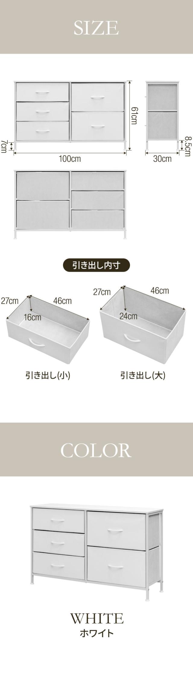 | サイズ: 本体:(約)幅100cm×奥行30cm×高さ61cm 引き出し(大)内寸:(約)幅46cm×奥行27cm×高さ24cm 引き出し(小)内寸:(約)幅46cm×奥行27cm×高さ16cm ※アジャスター:+1cm程度で微調整可能 |