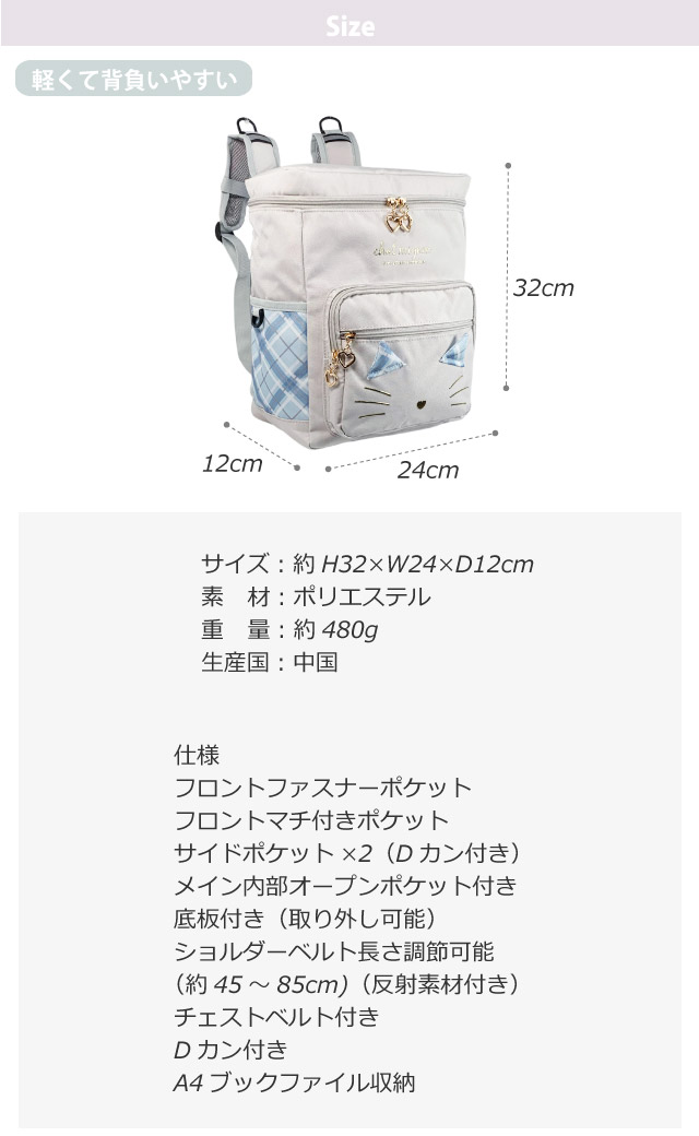 ![]() ![]() ![]() ![]() ![]() ![]() ・ポケットねこ ネコフェイスがかわいいのリュックサック。 A4サイズ対応でスクエア型なのでテキスト収納もきれいに収まります。塾や通学にもおすすめ。小学生に人気のデザインです。 誕生日プレゼント・クリスマスプレゼントにも人気です。