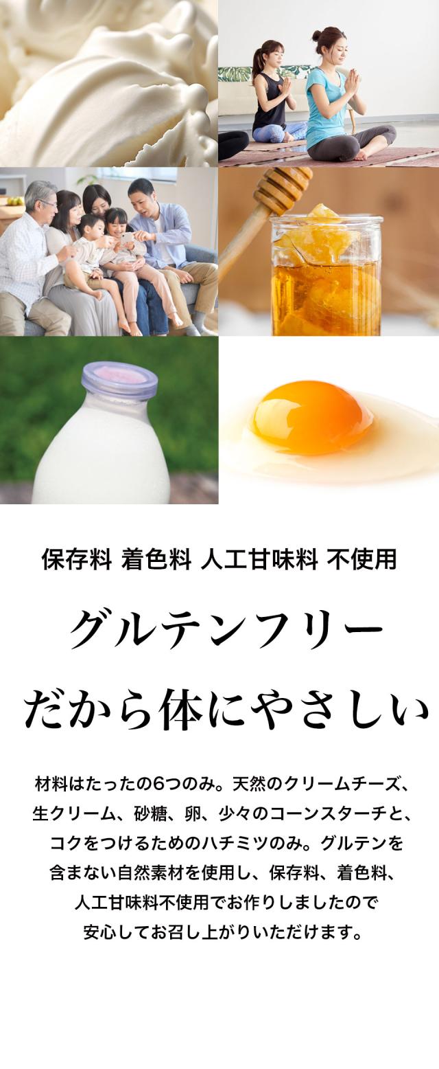 生クリーム(北海道産)、プロセスチーズ(生乳、食塩)、卵、ナチュラルチーズ(生乳、クリーム、食塩)、砂糖、とうもろこし、はちみつ/乳化剤、安定剤(増粘多糖類)、酸化防止剤(無水亜硫酸)