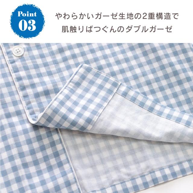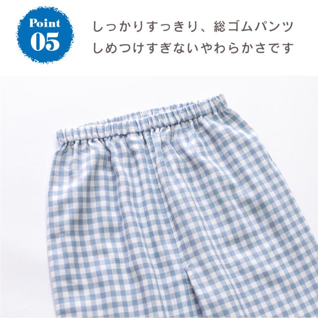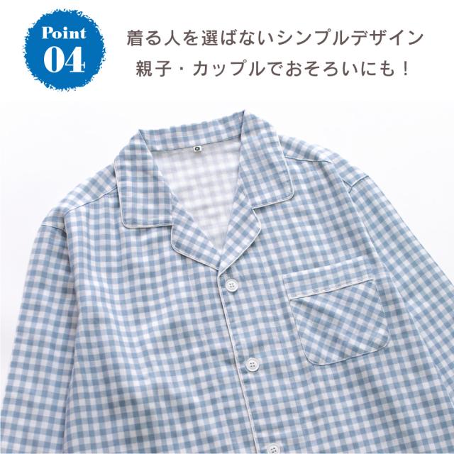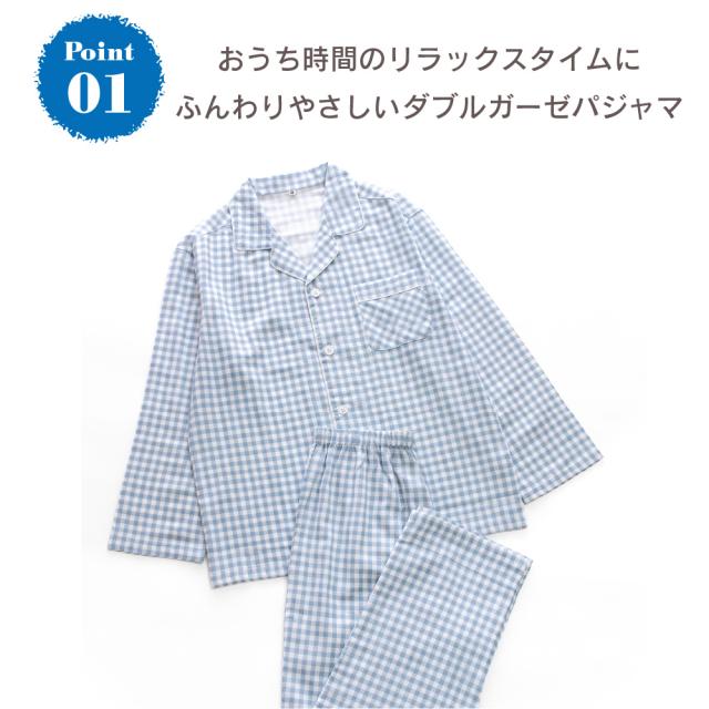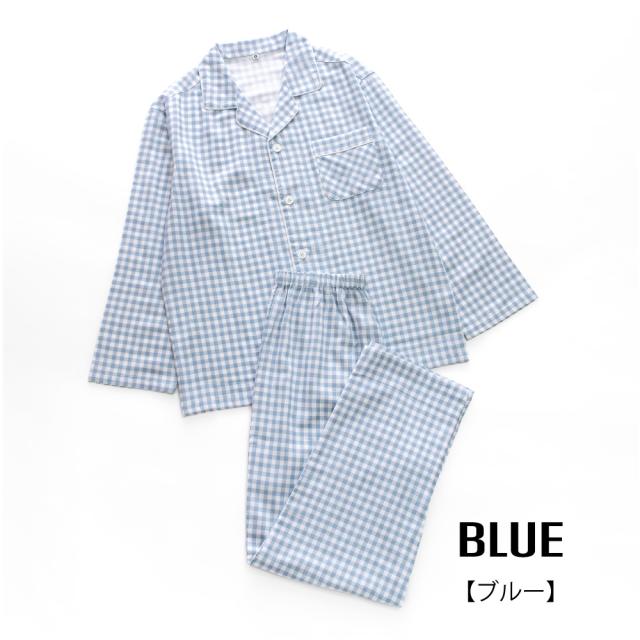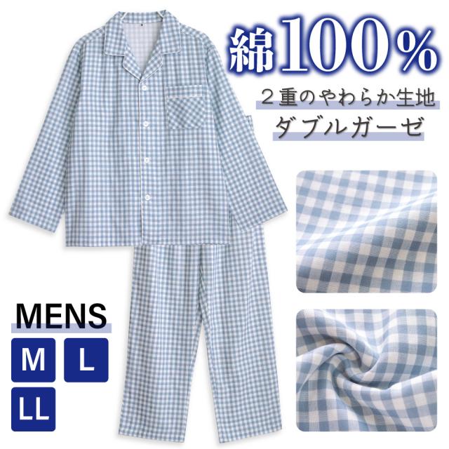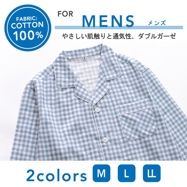 パジャマ メンズ 綿100% ダブルガーゼ 長袖 親子でおそろい 春 夏 秋向き 前開き ボタン ギンガムチェック ブルー M L LL 紳士 ギフト プレゼント 父の日 敬老の日 入院 旅行
