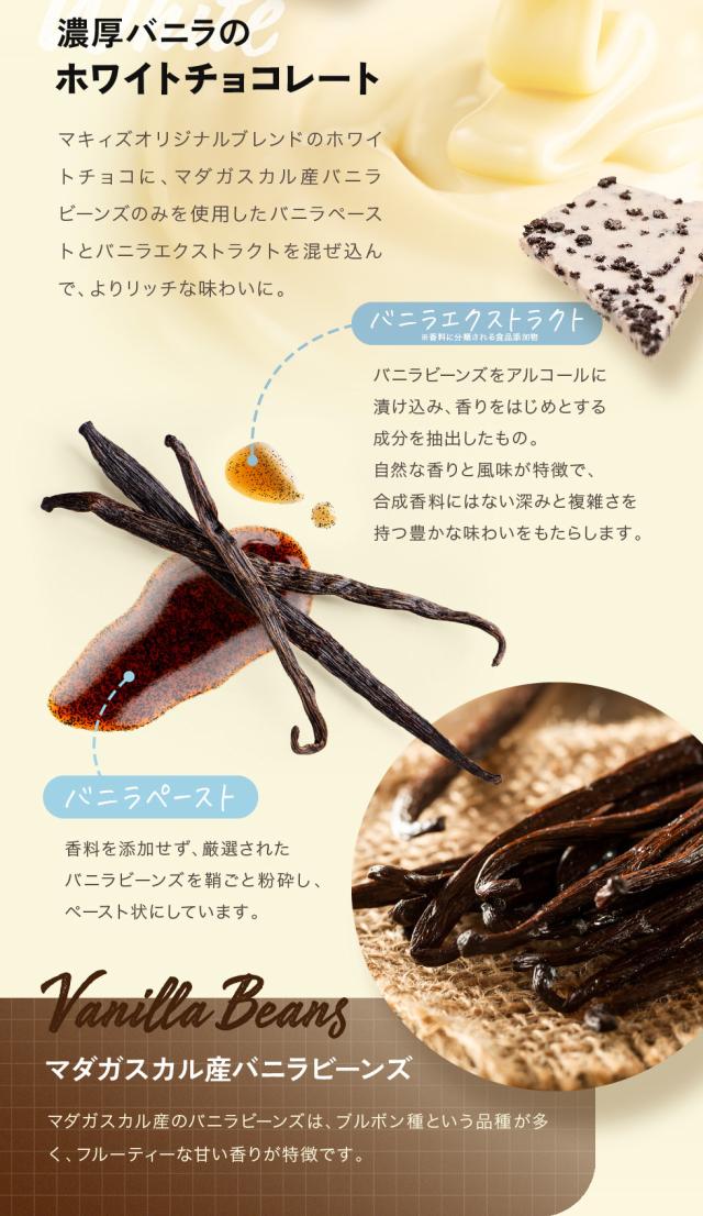 チョコレート(国内製造)、焼き菓子(砂糖、小麦粉、植物油脂、ココアパウダー、カカオマス、全粉乳、食塩、卵白)、ココアバター、バニラペースト(砂糖、バニラビーンズ、還元水飴)/香料、乳化剤、(一部に小麦・卵・乳成分・大豆を含む)