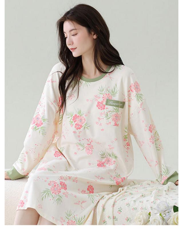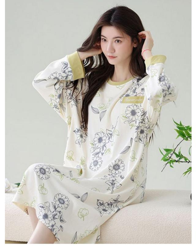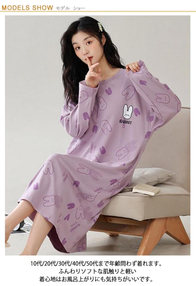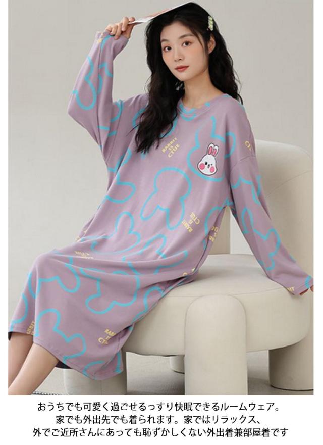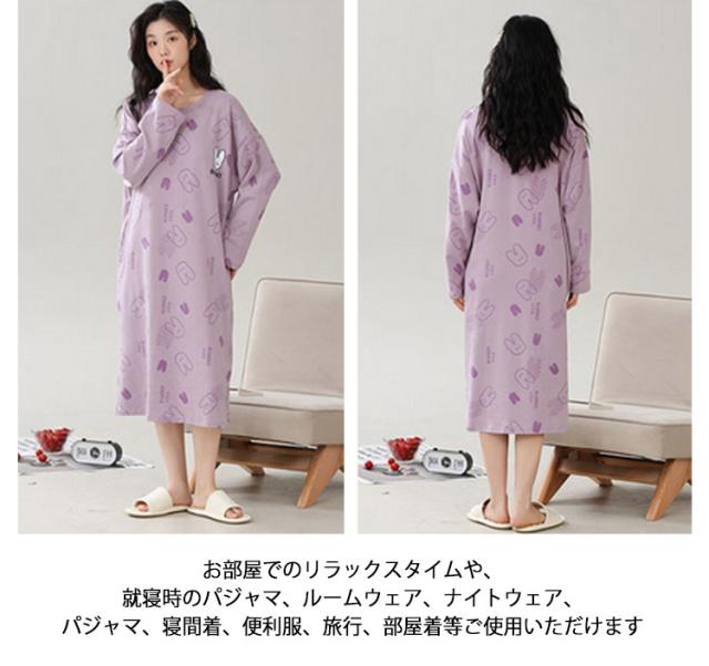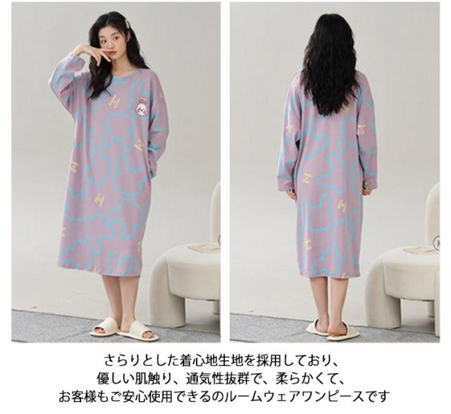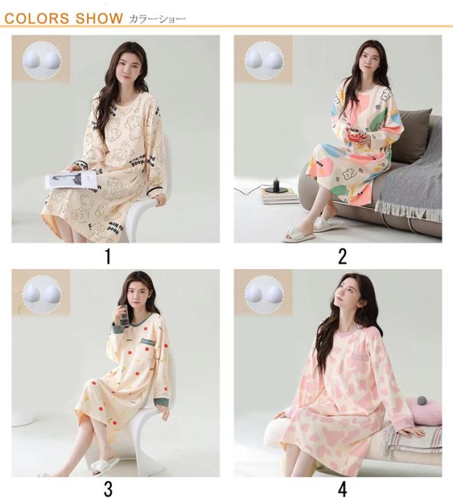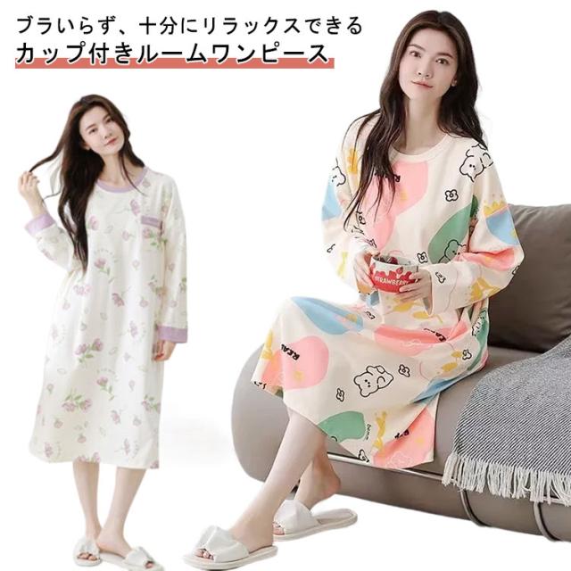 ルームウェア カップ付き ワンピース 長袖 パジャマ カップ付き クルーネック 部屋着 スウェットワンピース ロング ナイトウェア カップ付き ネグリジェ 柔らかい 総柄 寝間着 パジャマ 可愛い 秋 冬 春