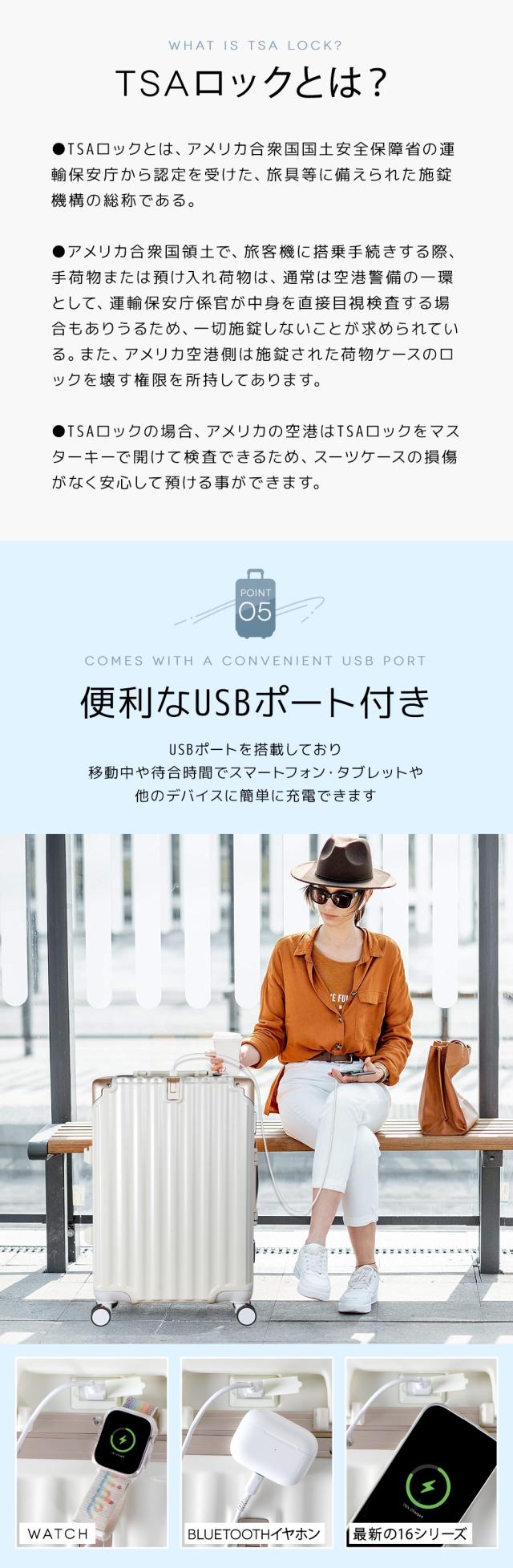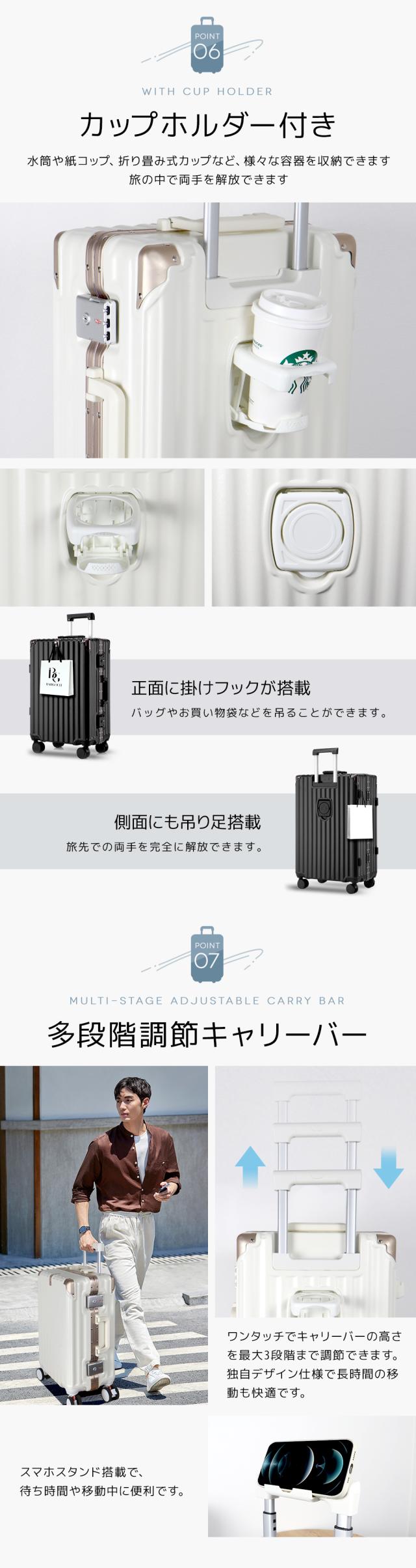 便利なUSB充電ポート、折りたたみ式カップホルダー、隠しフックなど様々な旅途中に約立つアイテムを搭載し、全ての需要に満たす最新仕様のスーツケースです。