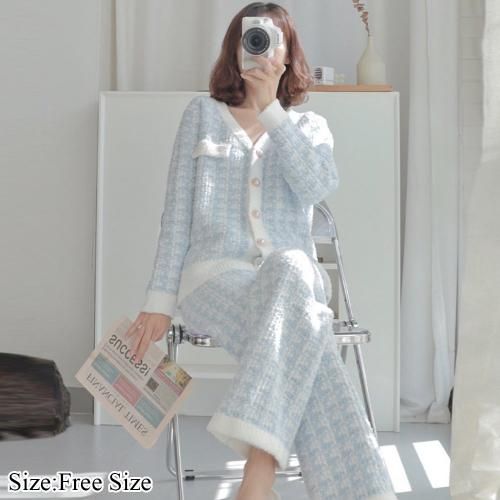 【グラシア】 ルームウェア モコモコ パジャマ 部屋着 パールボタン パール ラグジュアリー こなれ感 すっきり 胸元 ブルー フリーサイズ