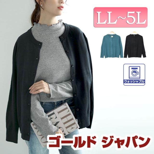 秋新作 大きいサイズ レディース トップス カーディガン 洗えるクルーネックカーディガン カーデ 羽織り 長袖 クルーネック ボタン 洗える 洗濯 ウォッシャブル もちもち 肌触り ストレッチ 伸縮 秋服 冬服 春服 LL 2L 3L 4L 5L ブラック 黒 ターコイズ ゴールドジャパン
