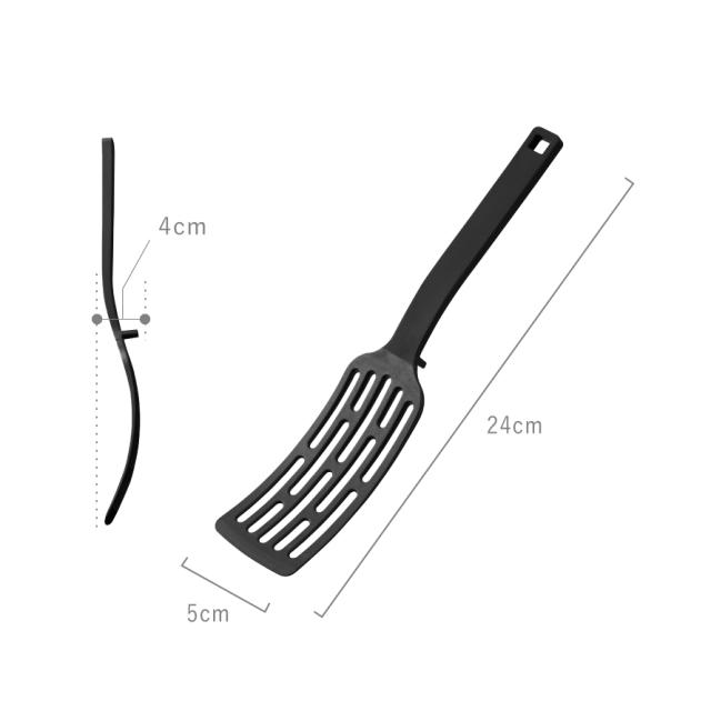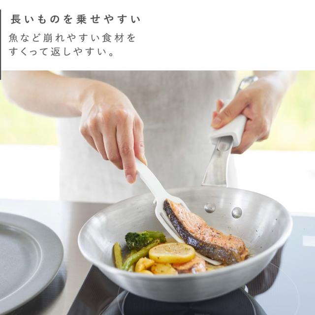しなやかに曲がりフライパン・鍋などをキズつけず、長い物を乗せやすいロングターナーSサイズ。フライパンと食材の間に入りやすく、長い物も形を保ったままひっくり返せます。