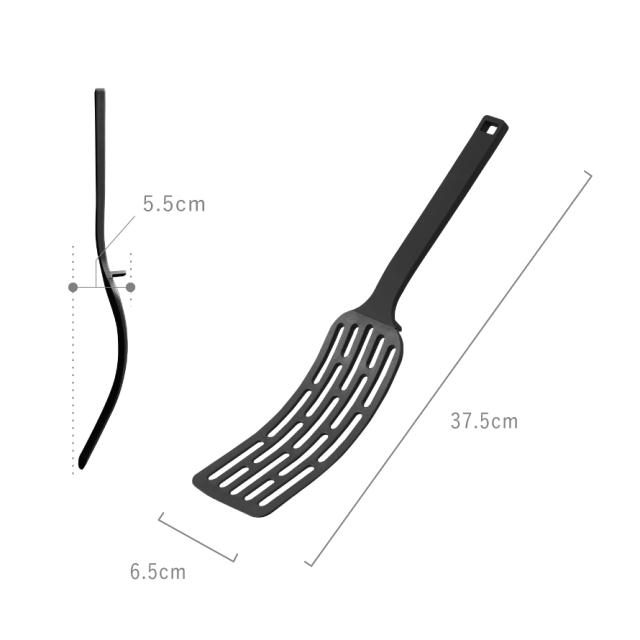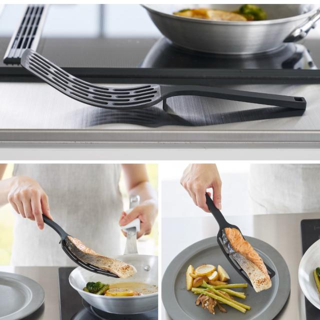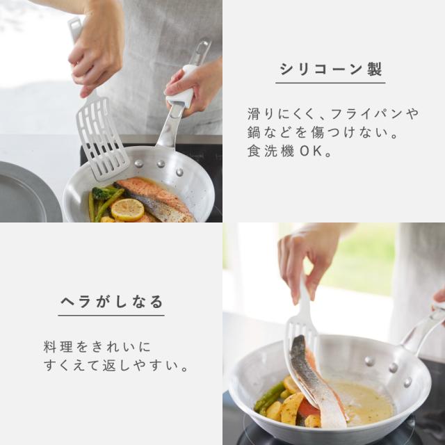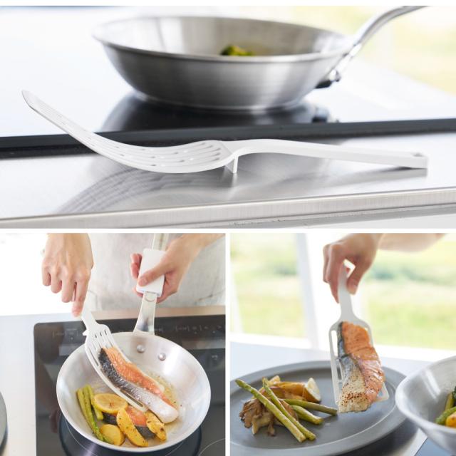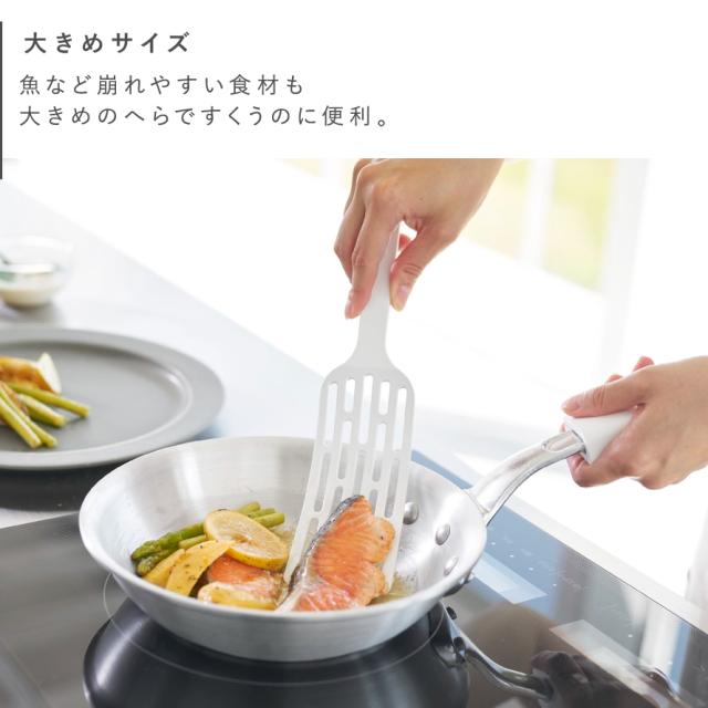 しなやかに曲がりフライパン・鍋などをキズつけず、長い物を乗せやすいロングターナー。フライパンと食材の間に入りやすく、長い物も形を保ったままひっくり返せます。