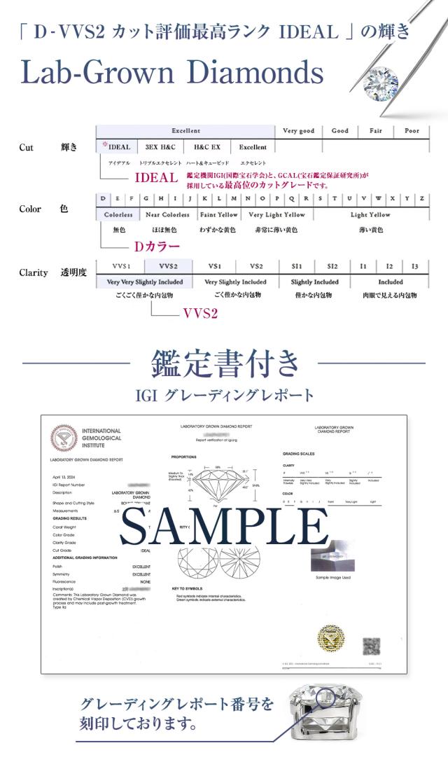 ラボグロウンダイヤモンドは「純度がとても高い」といった特徴があり不純物を含んでいないので「クリアで透明感のある輝き」を放ちます。ダイヤモンドのグレードは「最高ランクの無色透明度である" Dカラー" VVSクラス カット評価最高ランク IDEAL 」です。