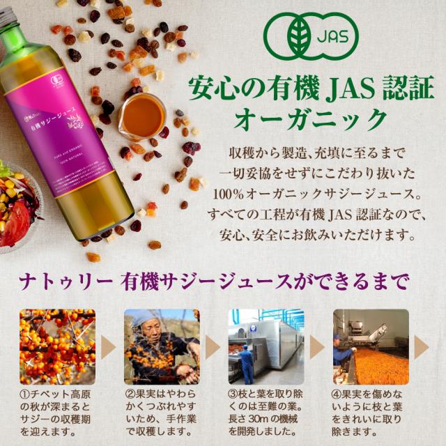 安心安全の証。有機JAS認証のオーガニックサジージュース。栄養素200種以上の優れもの。チベット高原の過酷な環境で育った希少種『シネンシスサジー』を100%搾ったジュースです。