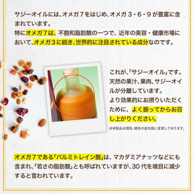 サジーにはオメガ7(パルミトレイン酸)が豊富。さらにオメガ3、6、9も含まれています。