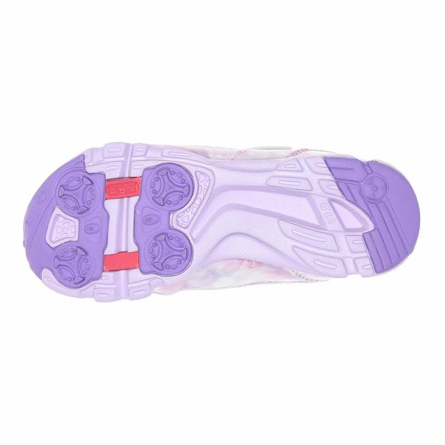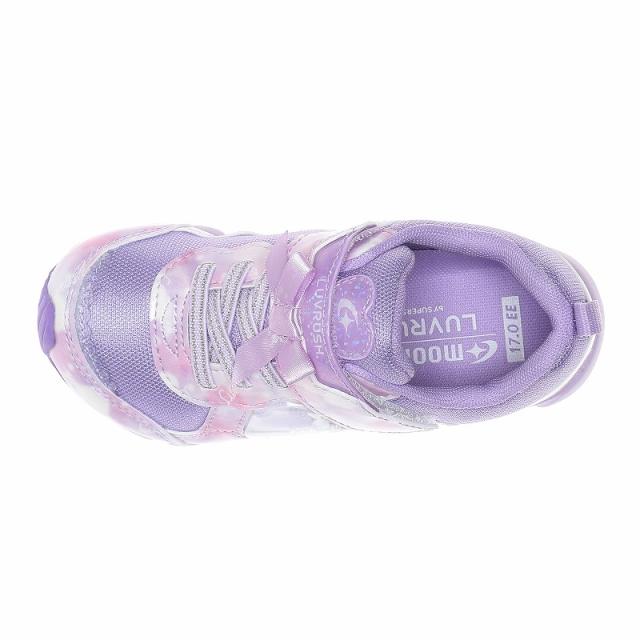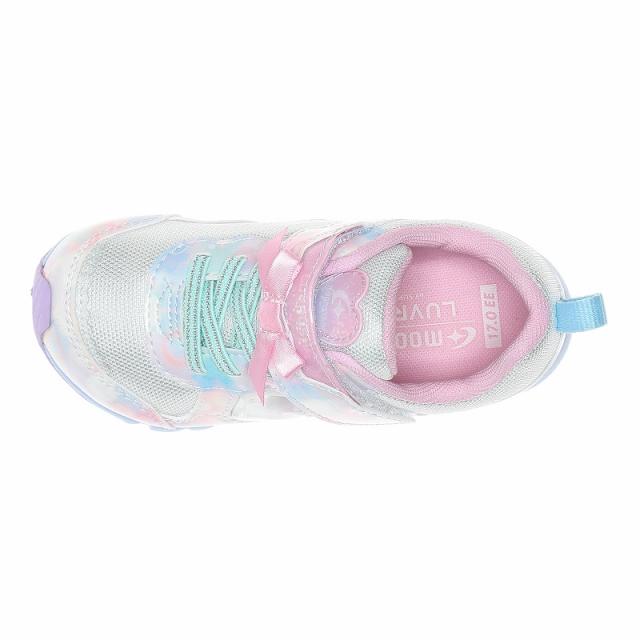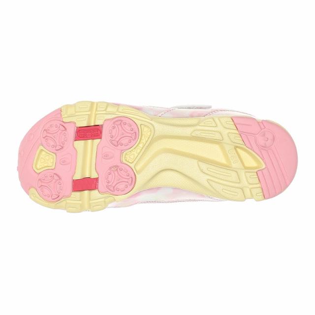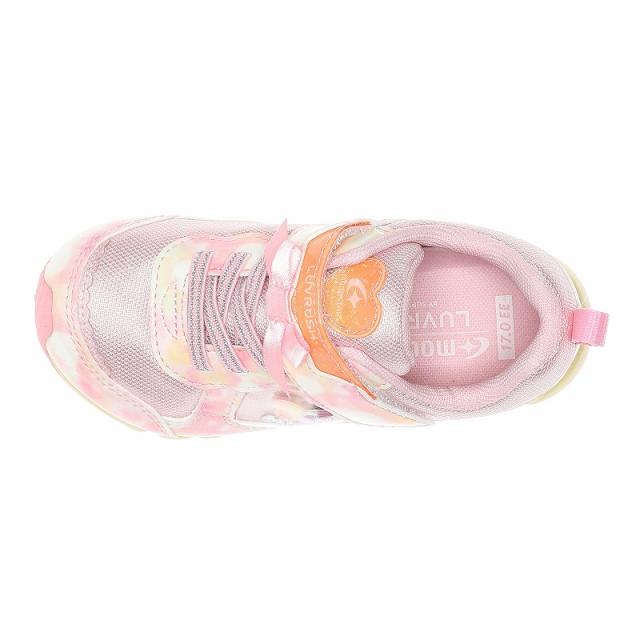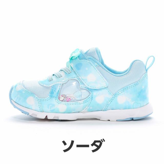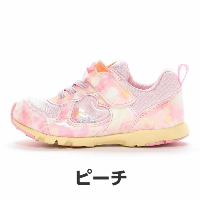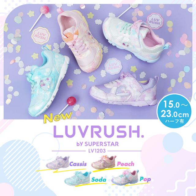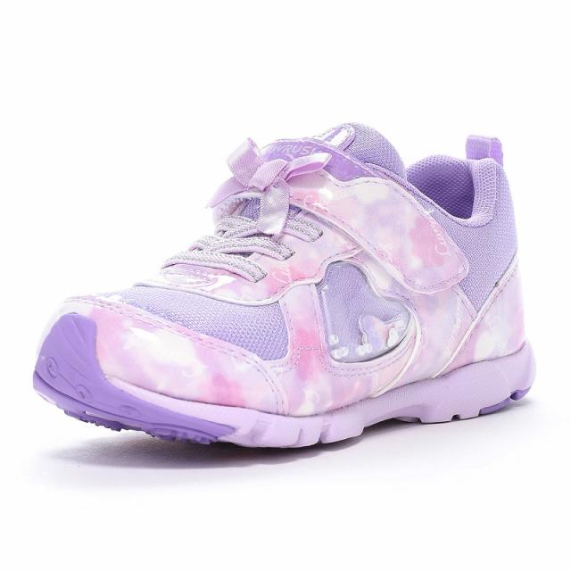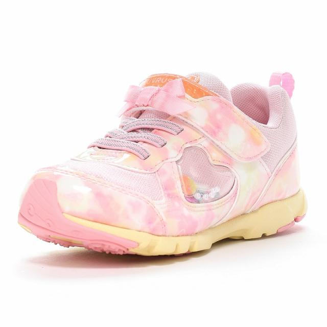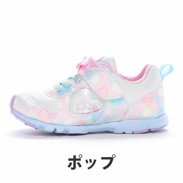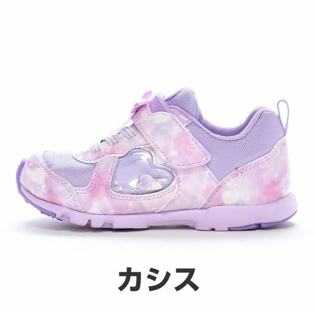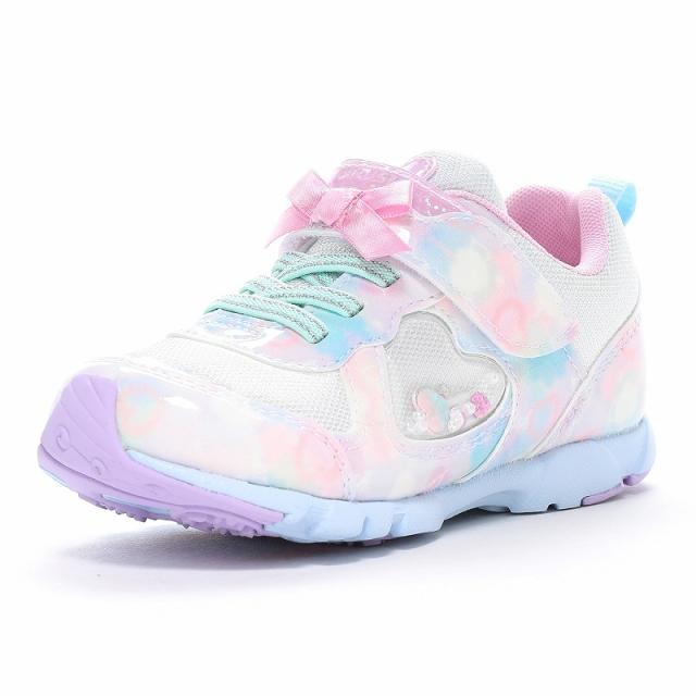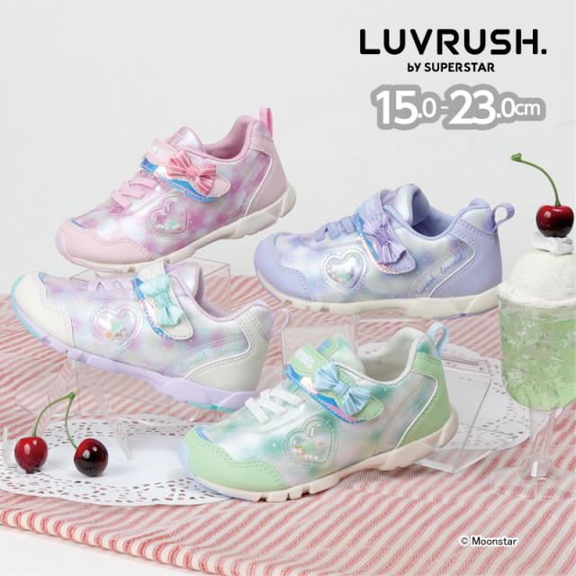 『もっと可愛く!もっと速く!女の子のスポーツシーンを足元から応援!』をコンセプトにガールズ向けに誕生した「ラブラッシュ バイ スーパースター」のキッズシューズです。「速く走る」を体現するために搭載されたパワーバネが走りをアシストします。重さは17.0cmで片足約100gです。【パワーバネ】ムーンスター独自開発の特殊なゴムを靴底に搭載し、地面を踏みこむときにパワーを蓄積し、蹴り出すと同時に一気にパワーを推進力に。【カウンターボックス】子どもの柔らかくゆがみやすい足を箱型構造でしっかり支えます。【Ag+抗菌防臭】銀イオンの抗菌作用でにおいのもととなる菌の増殖を抑制し、防臭効果を発揮します。【洗えるインソール】インソールは取り出して洗えるのでいつも清潔に保てます。【耐摩耗ラバー】靴底にはすり減りが少なく、高い耐久性を発揮するラバーを採用しています。【軽量設計】軽くなるよう工夫を施した設計です。モヤ柄やハート形で可愛いシャカシャカパーツ、リボンをあしらったキュートなデザインです。今シーズンは「ロリポップキャンディ」をテーマにキュートでカラフルなイメージを落とし込んだアイテムです。
