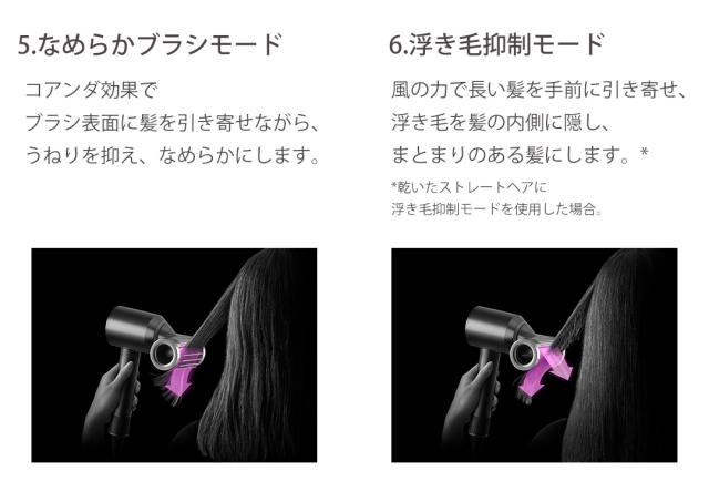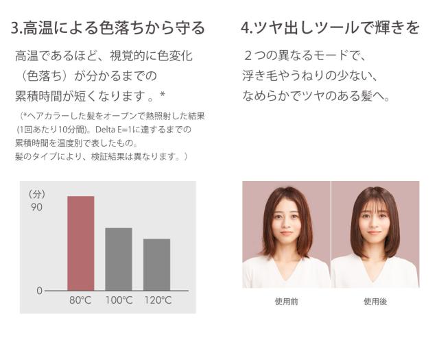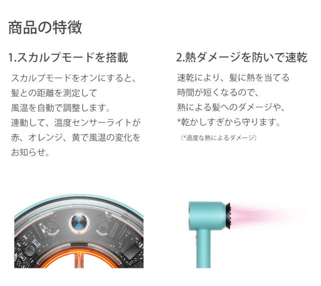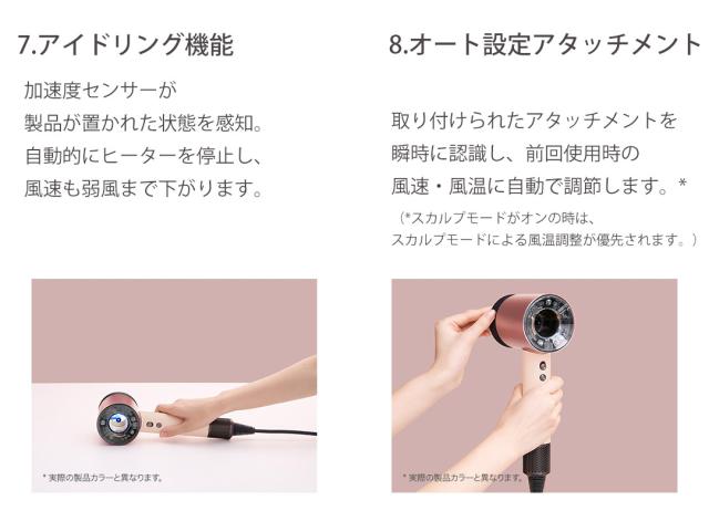 ●スカルプモードを新搭載 スカルプモードをオンにすると、髪との距離を測定して風温を自動で調整します。連動して、温度センサーライトが赤、オレンジ、黄で風温の変化をお知らせ。 ●熱ダメージを防いで速乾。* 速乾により、髪に熱を当てる時間が短くなるので、熱による髪へのダメージや、*乾かしすぎから守ります。 *過度な熱によるダメージ。 ●高温による色落ちから守る 高温であるほど、視覚的に色変化(色落ち)が分かるまでの累積時間が短くなります 。* *ヘアカラーした髪をオーブンで熱照射した結果 (1回あたり10分間)。Delta E=1に達するまでの累積時間を温度別で表したもの。髪のタイプにより、検証結果は異なります。 ●ツヤ出しツールで輝きを 2つの異なるモードで、浮き毛やうねりの少ない、なめらかでツヤのある髪へ。 ●なめらかブラシモード コアンダ効果でブラシ表面に髪を引き寄せながら、うねりを抑え、なめらかにします。 ●浮き毛抑制モード 風の力で長い髪を手前に引き寄せ、浮き毛を髪の内側に隠し、まとまりのある髪にします。* *乾いたストレートヘアに浮き毛抑制モードを使用した場合。 ●アイドリング機能 加速度センサーが製品が置かれた状態を感知。自動的にヒーターを停止し、風速も弱風まで下がります。 ●オート設定アタッチメント 取り付けられたアタッチメントを瞬時に認識し、前回使用時の風速・風温に自動で調節します。(低温ツールはアタッチメント未装着時の設定を記憶します。)* *スカルプモードがオンの時は、スカルプモードによる風温調整が優先されます。 |
