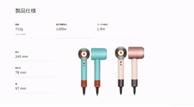 Dyson Supersonic Nural Shine ヘアドライヤー 頭皮から美しい髪を育み、サロンで仕上げたようなツヤめく髪へ。 本体カラー:セラミックパティーナトパーズ /セラミックピンク/さくらチェリー 定格消費電力:1200W ボルト数:100V 風量調整(段階):3 風温調整(段階):3 + 冷風 通常時の使用最高温度(弱風・高温の組合せで使用した場合):105度 温度過昇装置作動温度:145度 本体サイズ(高さ×幅×奥行き):245 × 78 × 97mm 本体重量:712g ケーブルコードの長さ:1.9m 本体同梱付属品:なめらかツール / 低温ツール / ツヤ出しツール |