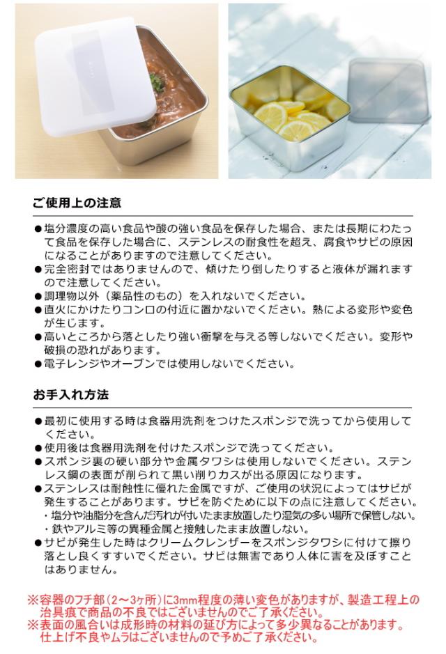 完全密封ではありませんので、傾けたり倒したりすると液体が漏れますので注意してください。 電子レンジやオーブンでは使用しないでください。 容器のフチ部(2〜3ヶ所)に3mm程度の薄い変色がありますが、製造工程上の痕で商品の不良ではございません。 表面の風合いは個々に多少異なる場合がありますが、仕上げ不良やムラではございませんので予めご了承ください。 |
