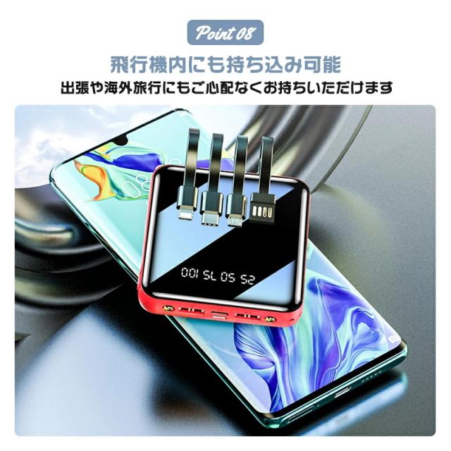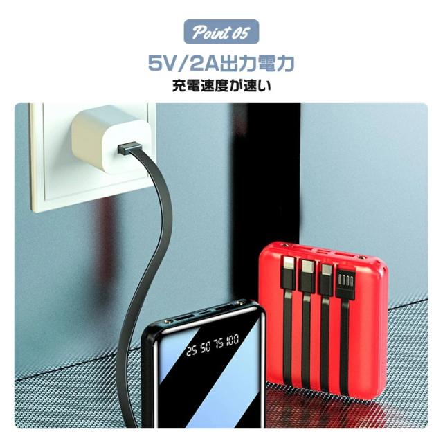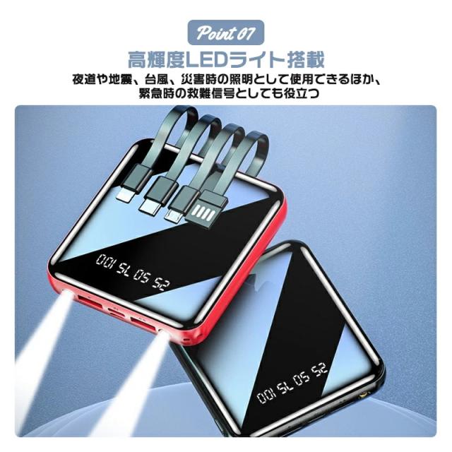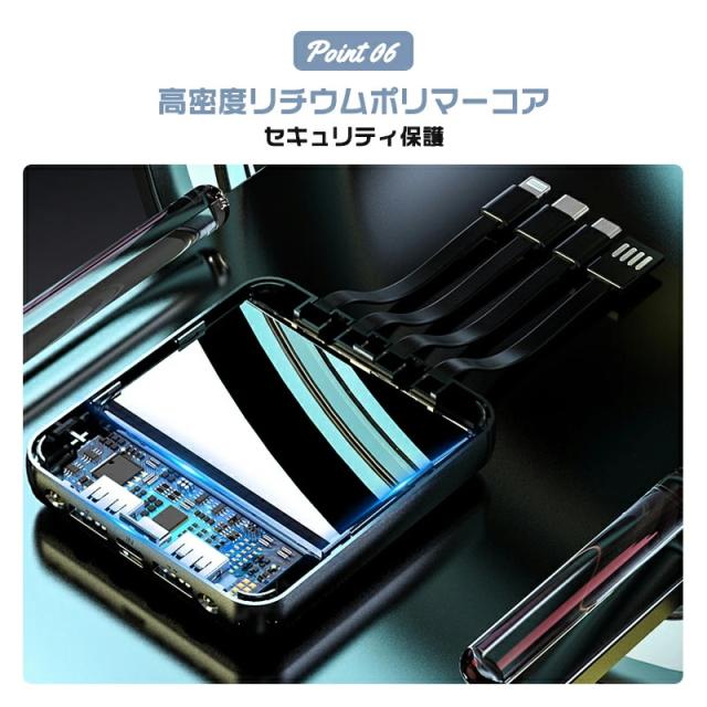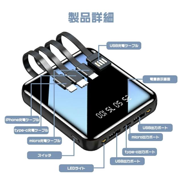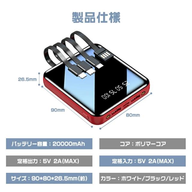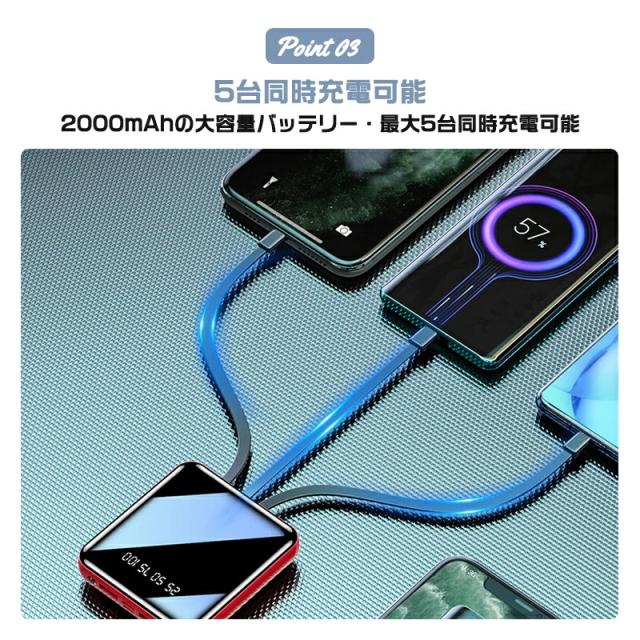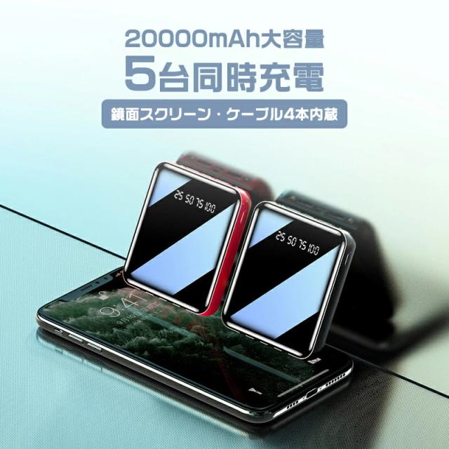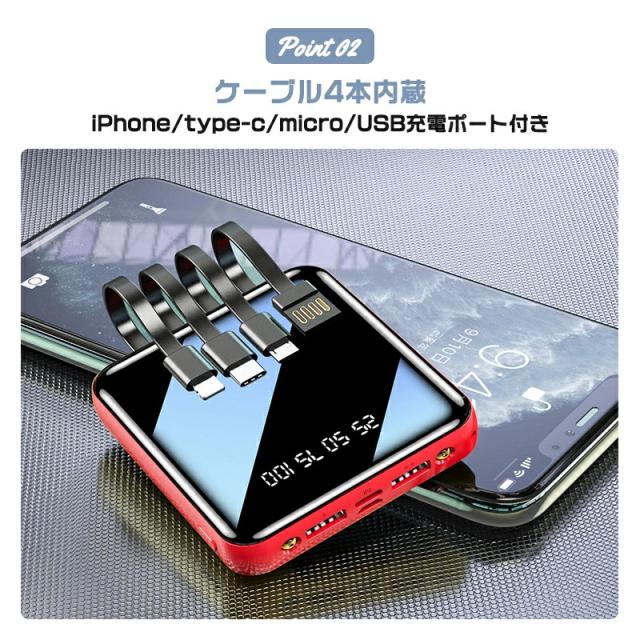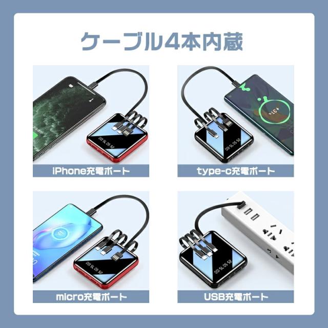 モバイルバッテリー コード付き 充電 小型 20000mAh 超小型 ケーブル4本内蔵 大容量 急速充電 iPhone16スマホ充電器 鏡面スクリーン 5V/2A type-c USB より増量 コンパクト 軽量 便利グッズ 旅行 停電対策 防災グッズ iPhone/Android お歳暮