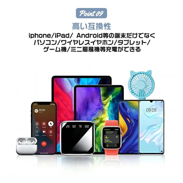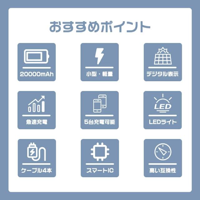 20000mAhの超大容量により、スマホとタブレットはもちろん、カメラ、ゲーム機などにも数回に充電できます。